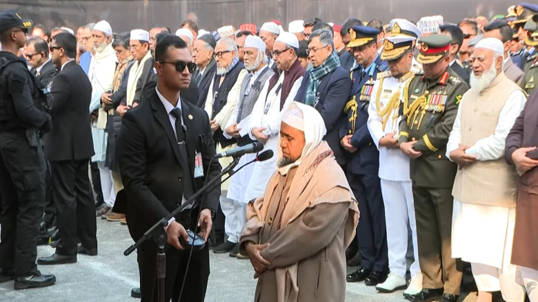 জানাজার ইমামতি করেন জাতীয় মসজিদ বায়তুল মোকাররমের খতিব মাওলানা আবদুল মালেক। সাবেক এই প্রধানমন্ত্রীর জানাজায় অংশ নেন প্রধান উপদেষ্টা ড. মুহাম্মদ ইউনূস।সেনাবাহিনী প্রধান জেনারেল ওয়াকার-উজ-জামানসহ বিভিন্ন বাহিনীর প্রধানসহ সব রাজনৈতিক দলের শীর্ষ নেতারাও উপস্থিত ছিলেন।